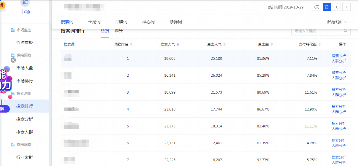 这各渠道是数据相对比较准确的,里面有搜索词和长尾词的排行,以及飙升状况,根据需要选择关键词和词根,例如产品基础不错的或者标品类产品可以适当选择精准核心词,相反则优先选择长尾词进行针对性的击破。参考维度搜索人气、点击率、支付转化率,数据越高相对越好。