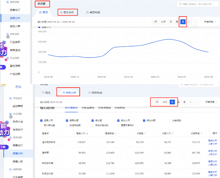 这个渠道的数据也是相对准确的,在这个渠道输入关键词进行搜索,例如连衣裙这个词,选择月的话,可以看到近1年的趋势。点击相关分析,选择时间段,就会展示与搜索关键词先关联的关键词,在根据自己的目的性选择即可,主要参考维度,搜索人气、点击率、支付转化率、在线商品数和商城占比。