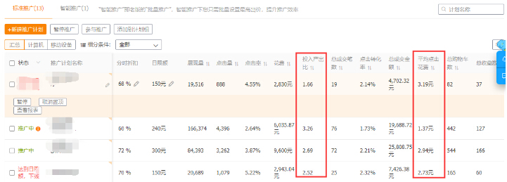 直通车一天付费在1000左右,推广4~5个计划,一款计划的限额在100~200,接手之后针对直通车计划完全优化了一遍关键词和人群,分析了一下生意参谋发现有些款式的流量和转化都不错,所以新加了一个智能计划运用多款测试的方式去推广引流,日限额在100元。之后发现这个计划ppc要比标准的低,投产还是比较不错的,所以这个计划一直在优化中。以下是智能计划的一个数据反馈。