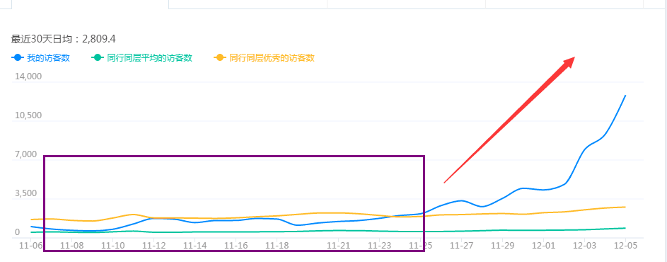标注:这个阶段可以看到,10月份到11月初的店铺数据并不是很好双十一前也一直处于不温不火的状态,相信很多卖家朋友都经历过或者正在经历着,那么这一个多月的时间这个店铺都在忙些什么事情,做了哪些动作,店铺的访客会有这样的变化,想必这些才是大家坚持耐心不厌其烦的看这个帖子最关键的因素了(其实我懂你的),事出必有因,接下来我来挑几个点重点说一下。