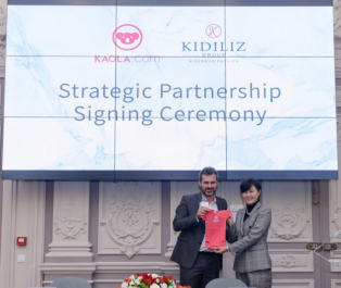 (图片:签约现场,Kidiliz集团CEO向网易考拉海购CEO张蕾赠送印有考拉logo的童装)